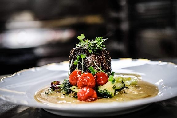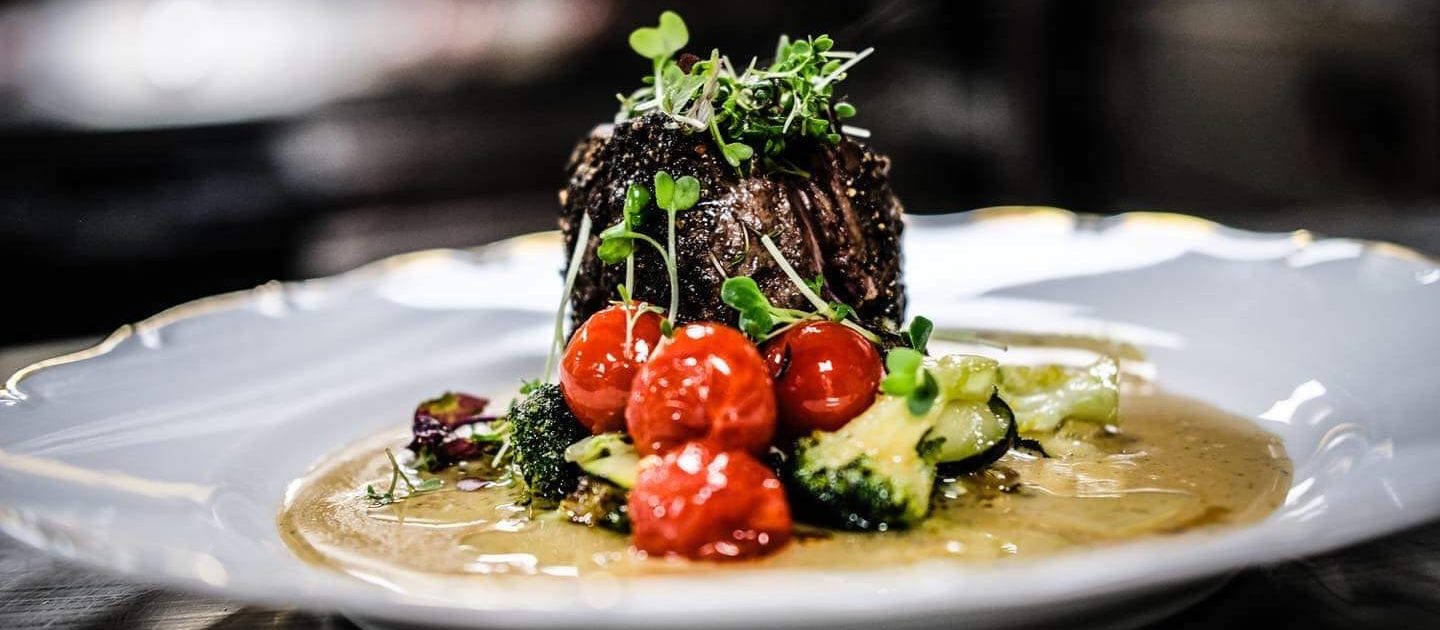 200g oxfilé med pepparsås, säsongens grönsaker, confiterade tomater & strips